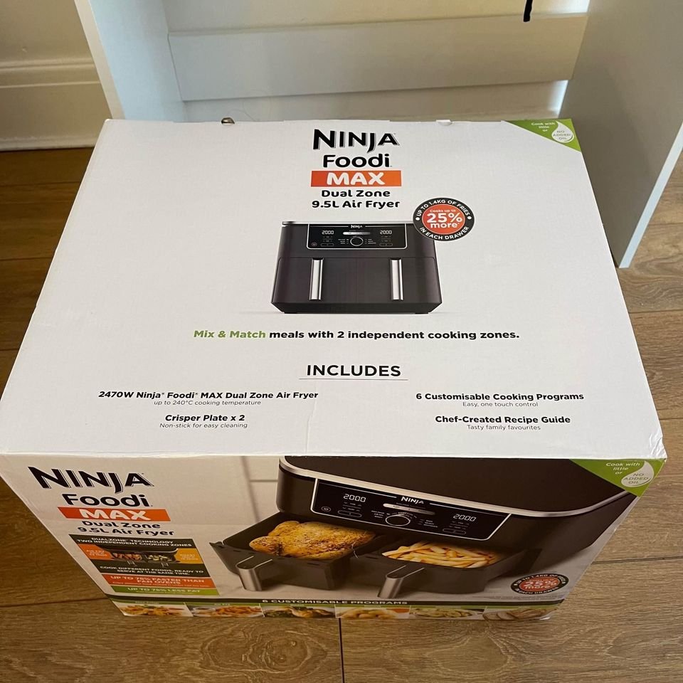 - INCLUDES: Ninja Dual Drawer Air Fryer (UK Plug), 2x non-stick dishwasher-safe 4.75L Drawers (9.5L total capacity) & Crisper Plates. Chef-created Recipe Guide. Weight: 8.9kg. Colour: Black.