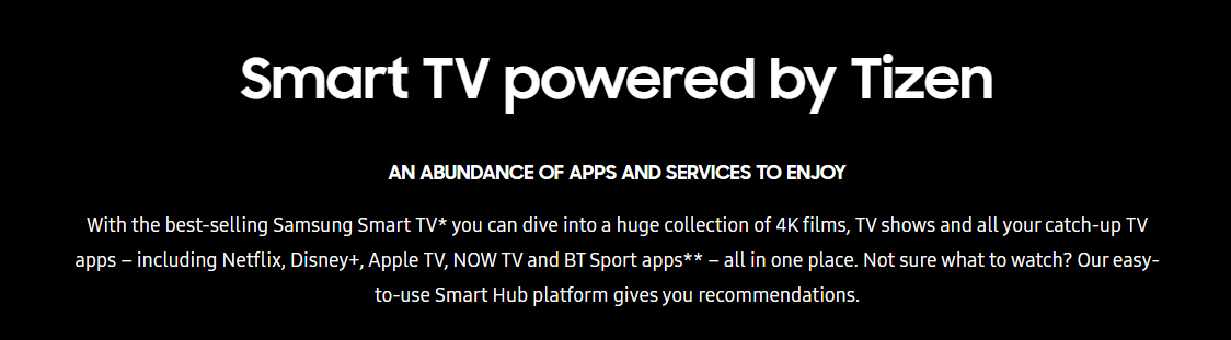 With the best-selling Samsung Smart TV* you can dive into a huge collection of 4K films, TV shows and all your catch-up TV apps – including Netflix, Disney+, Apple TV, NOW TV and BT Sport apps** – all in one place. Not sure what to watch? Our easy-to-use Smart Hub platform gives you recommendations.